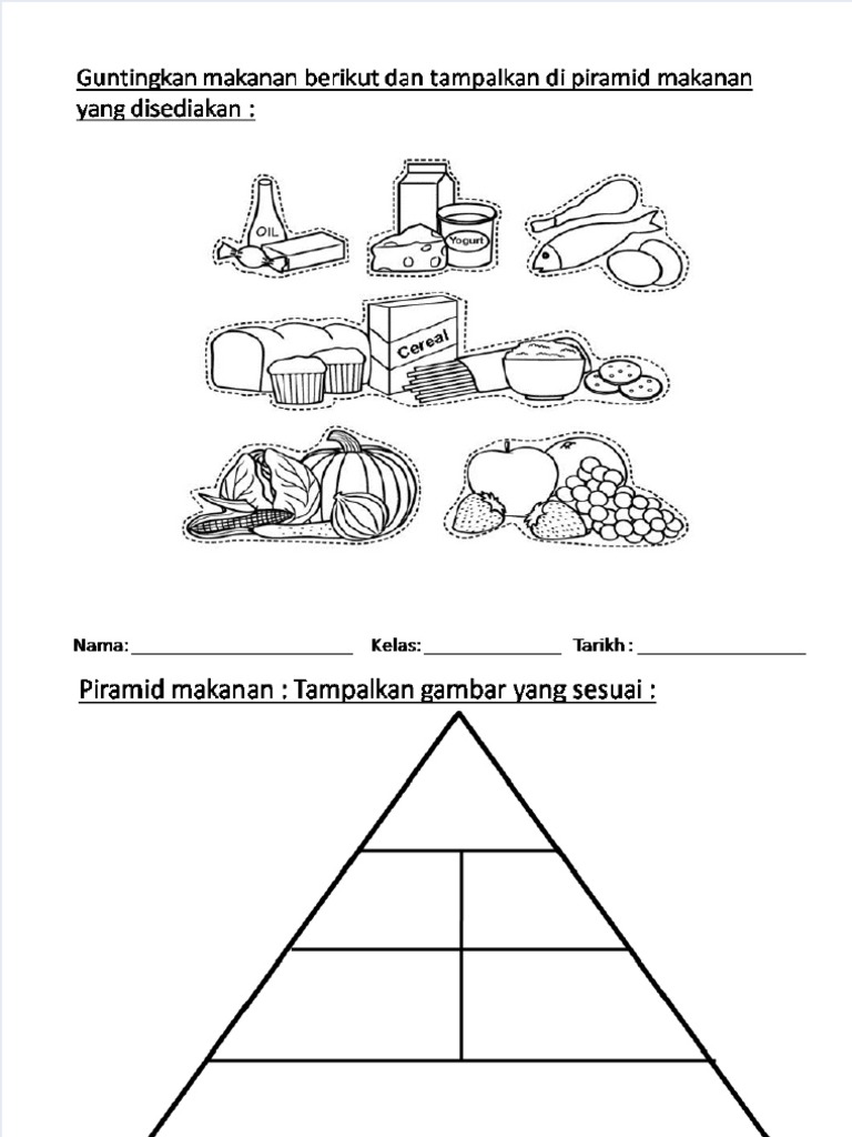 Untuk menjaga kesihatan diri lembaran kerja. Lembaran kerja piramid makanan-pinggan makanan seimbang menguji tahap penguasaan murid tentang makanan seimbang. Lepas tu cikgu buat kesimpulan tentang makanan kegemaran diorang tu sihat ke tak seimbang ke tak dan cikgu perkenalkan piramid makanan guna.
