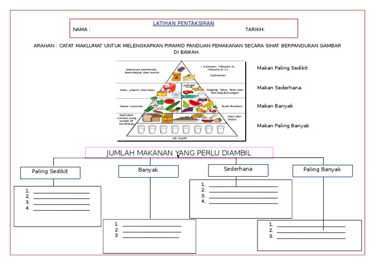 Lembaran kerja piramid makanan-pinggan makanan seimbang menguji tahap penguasaan murid tentang makanan seimbang. 1002100 fanden dieses dokument. Baca versi flipbook dari perancangan tahunan.